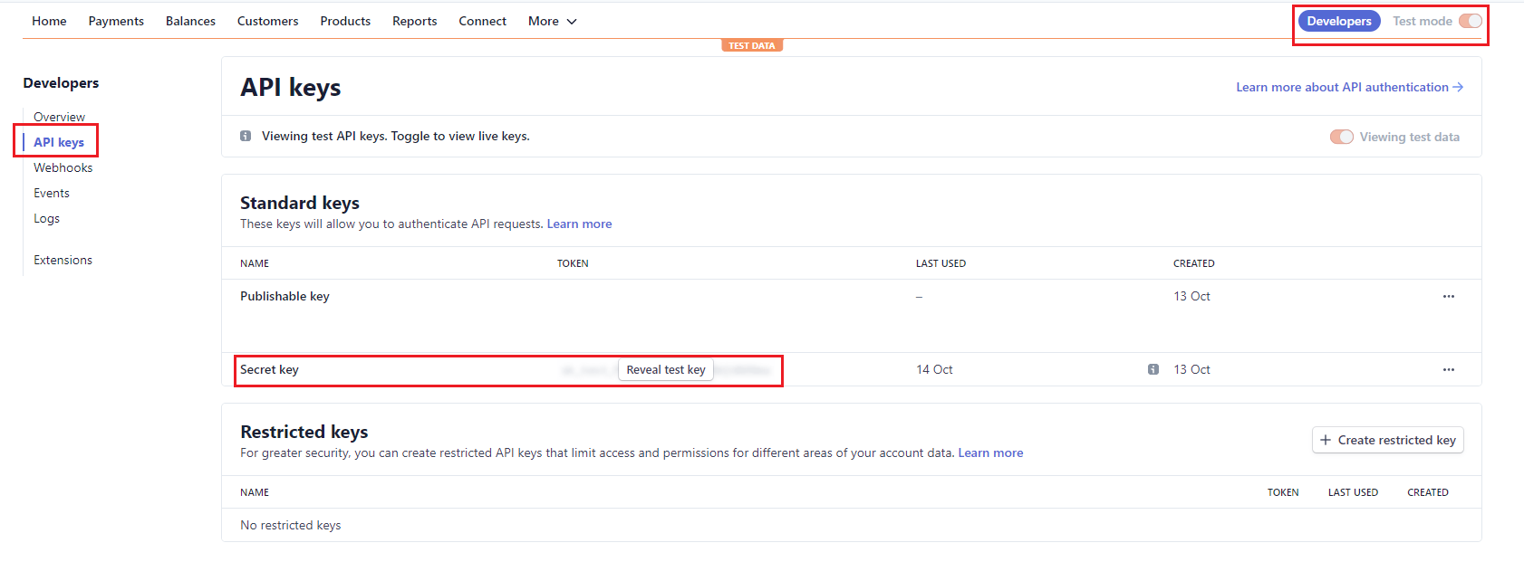 You'll need to add a Stripe secret key for payment integration. If you don't have a Stripe account already, create one here. Once you've created your account, go to the API Keys section in the Developers tab to get the Secret key: