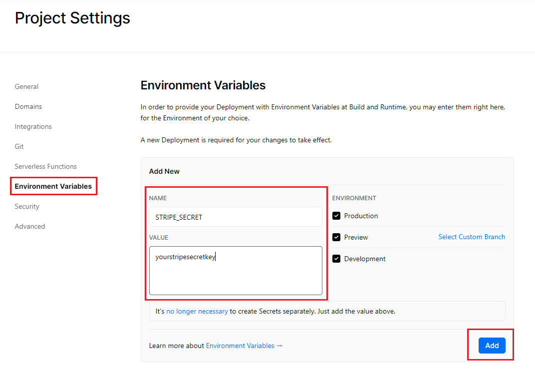 Next, you need to add a new environment variable called STRIPE_SECRET to your project in Vercel under project settings: