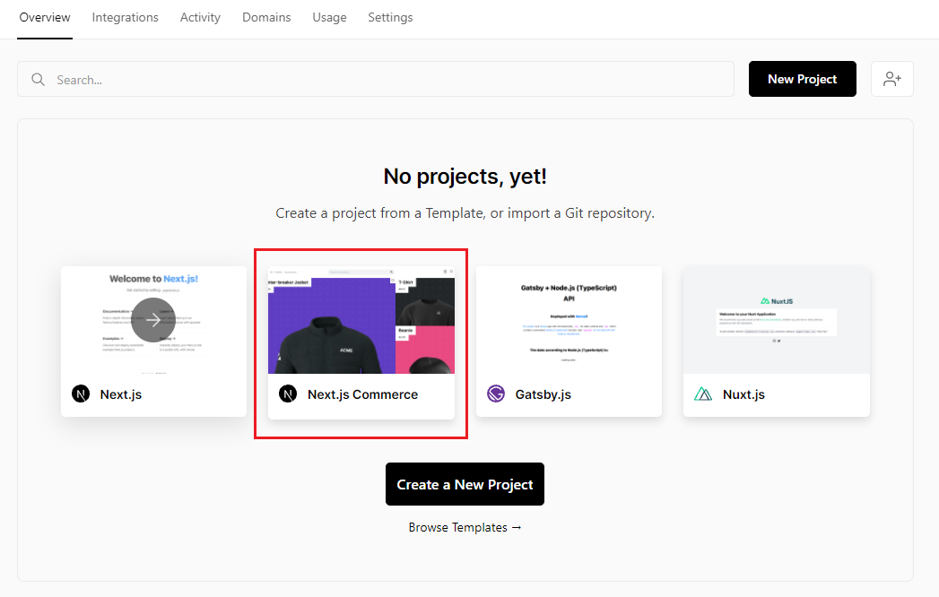 So you've created your Sitecore OrderCloud and Vercel accounts. Next up, you need to create a new project in Vercel. Go to the Overview tab and click on the Next.js Commerce tile to start the project creation wizard.