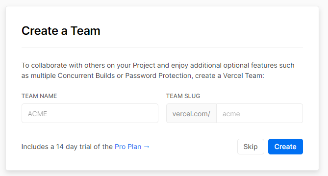 Next up, you can choose to create a team if you want to collaborate with others on the project. Note that you need to be on at least a pro plan if you want this feature. I'll skip this for now.