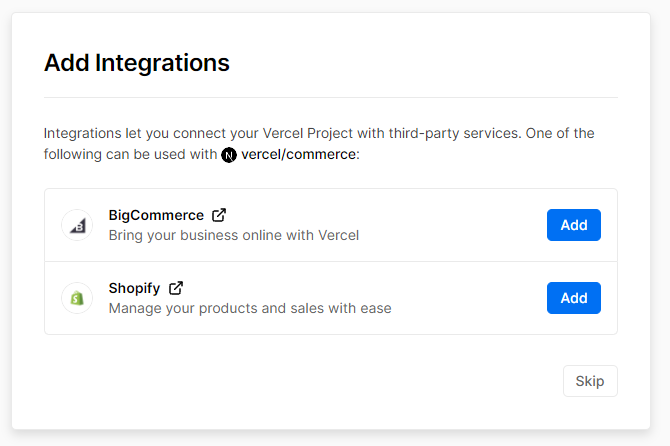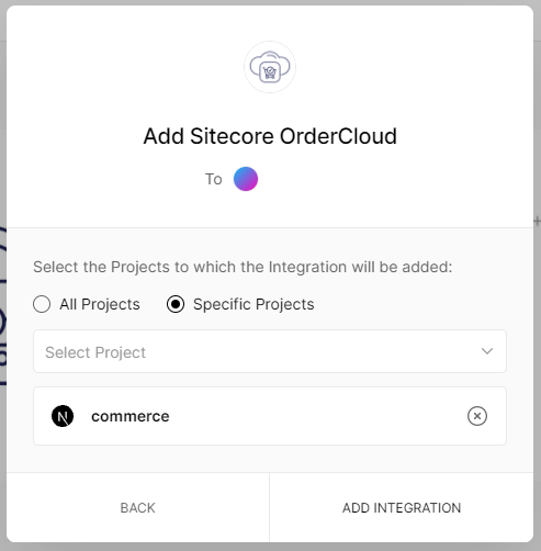 Note that you don't see the OrderCloud integration here in the list of integrations. Don't worry about this and skip for now. We will add the integration separately after the project is created.