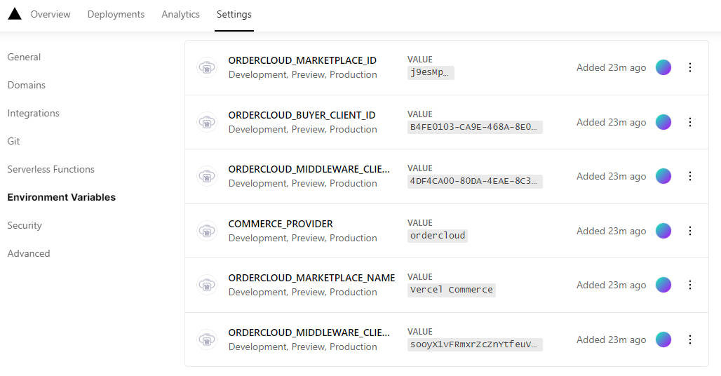 Configuration details for the OrderCloud APIs are also added to the project environment variables in Vercel. You can find these under project settings: