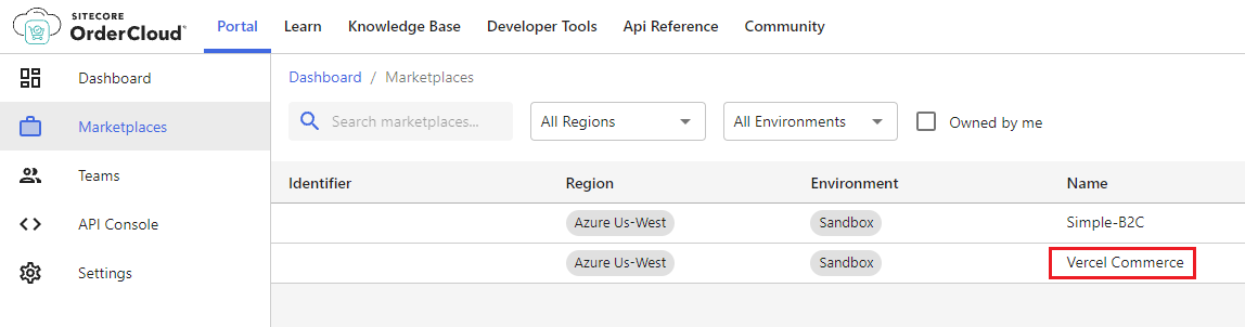Once the integration has been added, head over to the OrderCloud portal and verify that the new marketplace has been created: