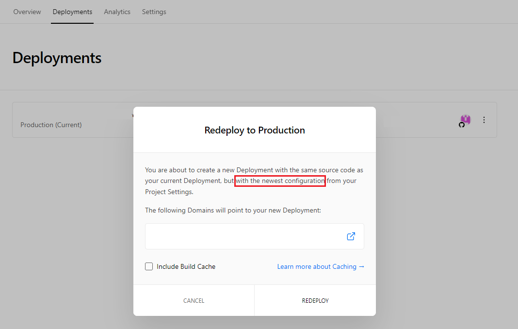 Finally, you will need to redeploy your project for the integration to be completed. Go to the deployments section of your Vercel project and select 'Redeploy to Production':