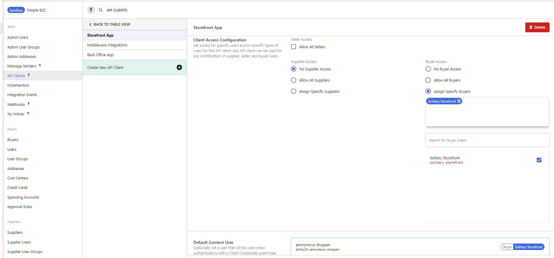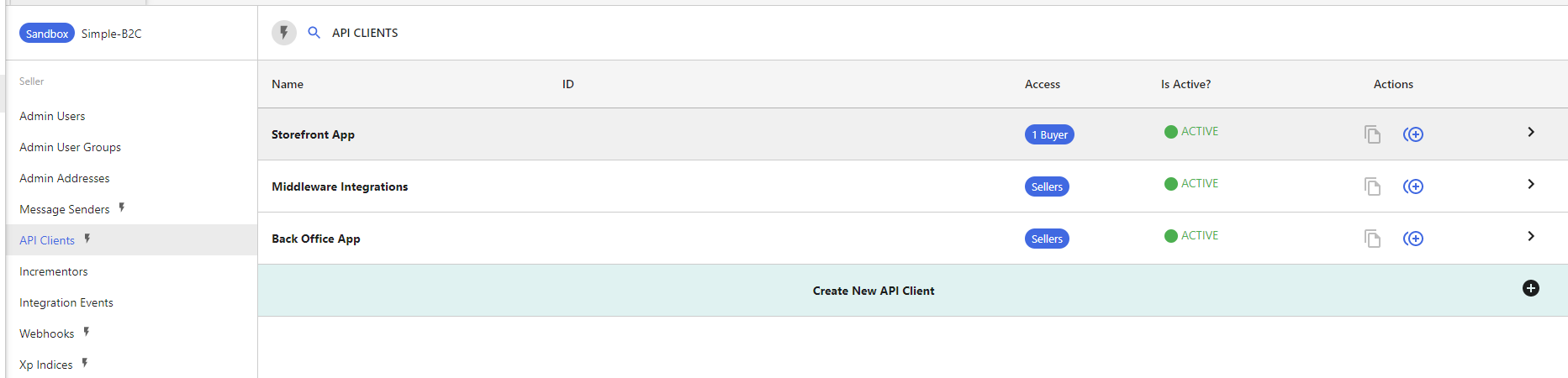 Three API clients have been created as part of the seeding process- one for the storefront app (buyer experience), one for middleware integrations, and one for the back office admin app (seller/admin experience).