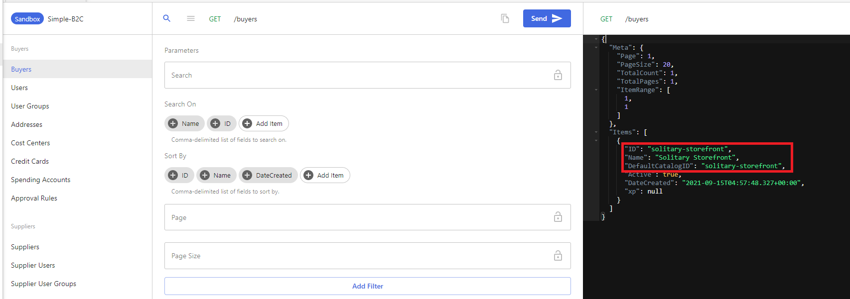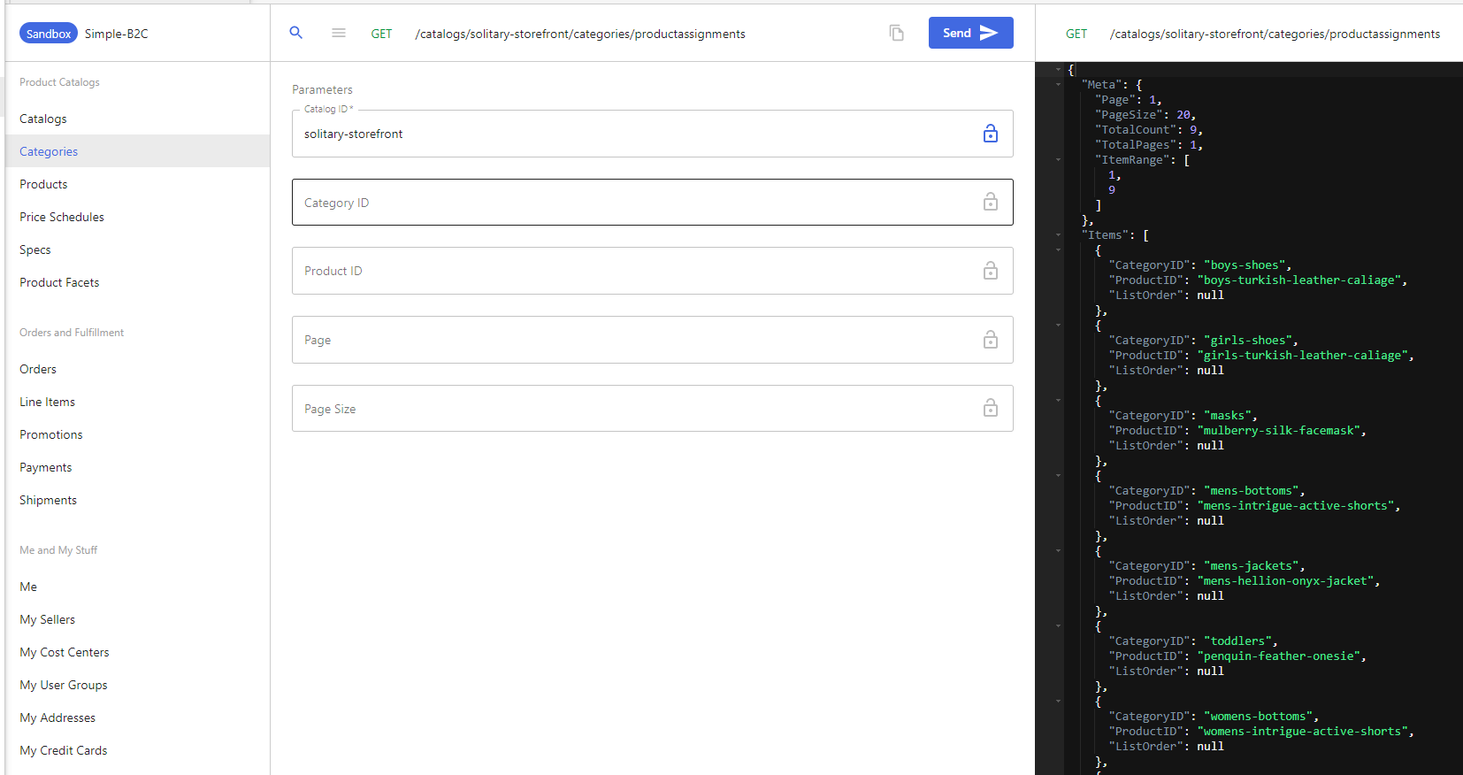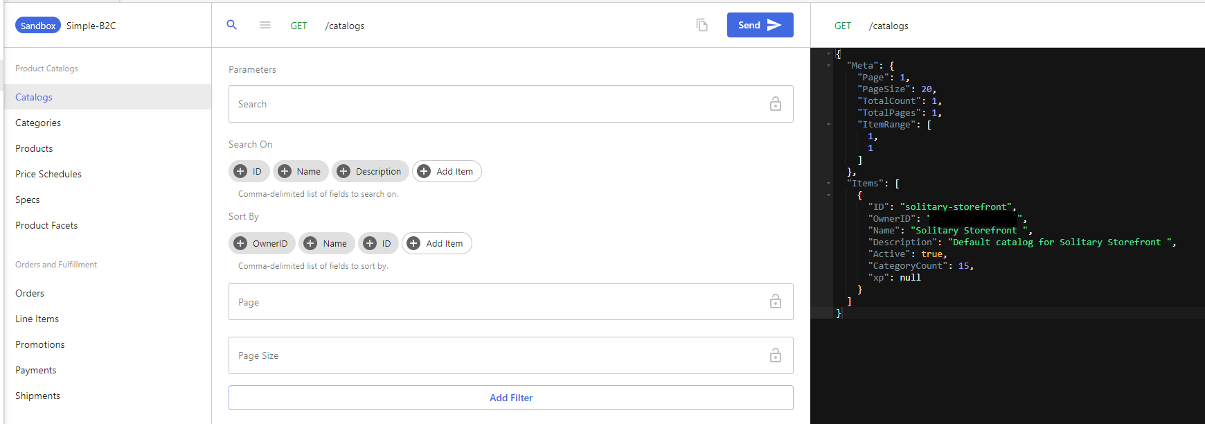 When getting a list of catalogs, you'll notice that the response does not contain catalogs assignments. This is because catalogs can be shared between buyers. To get the list catalog assignments, you can query the list catalog assignment endpoint. In this case, you'll see the 'Solitary Storefront' catalog is assigned to the default 'Solitary Storefront' B2C buyer.
