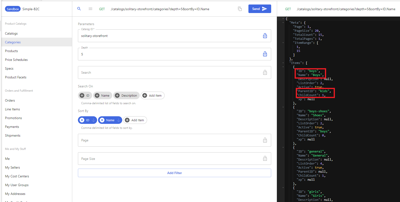 Various categories have been created under the default 'Solitary Storefront' catalog. Note that this includes nested categories as can be seen by the ParentID and ChildCount fields. More information on managing categories can be found here.