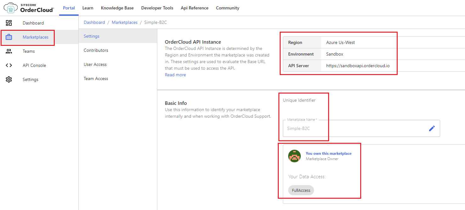 As you can see below, a new marketplace called Simple-B2C has been created. The highlighted areas show key aspects such as environment details and your marketplace permissions. Since I've created the marketplace, I'm the owner.