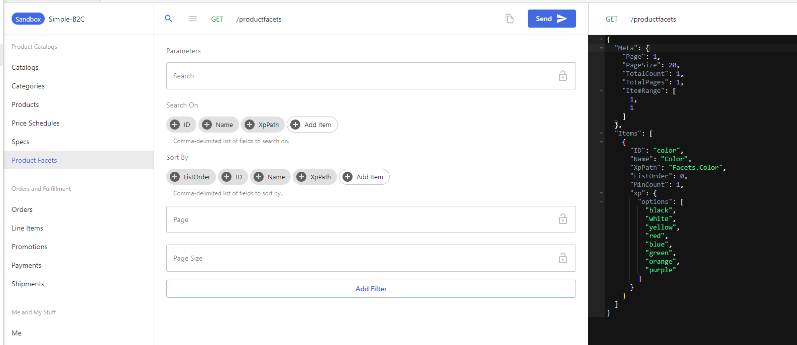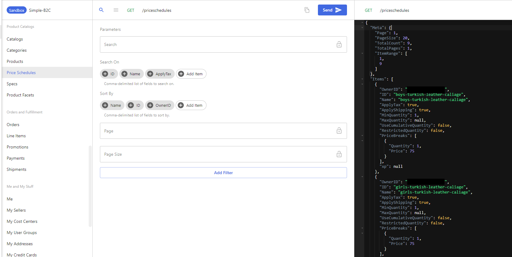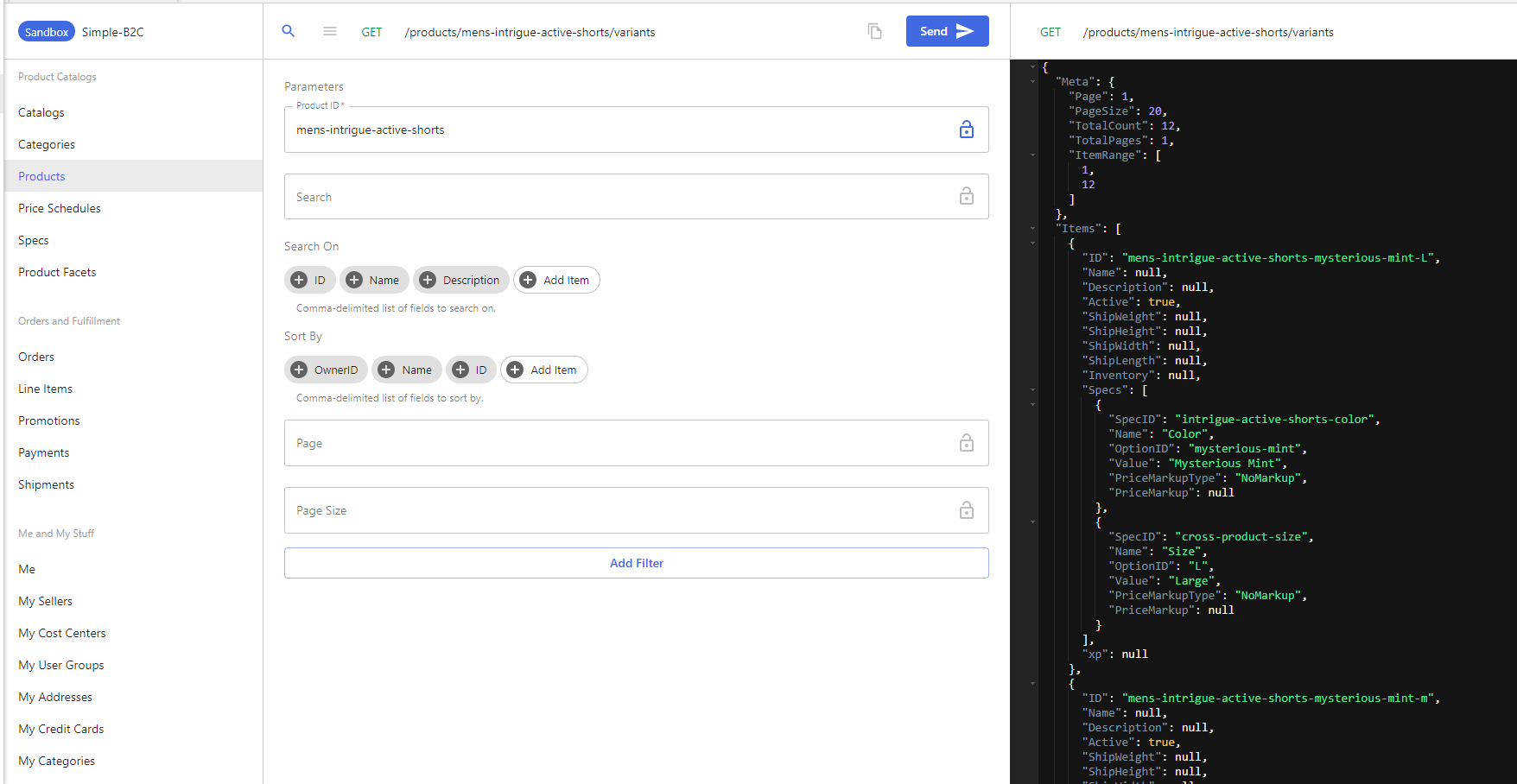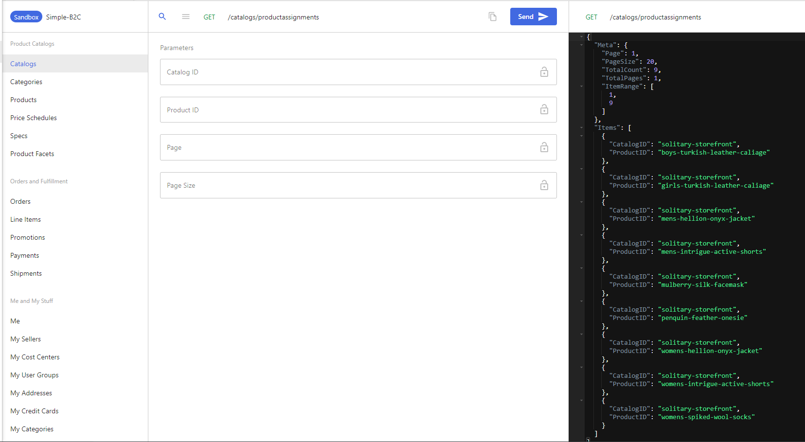 When getting the list of products, you'll notice that the response does not return associated catalogs. This is because the same product may be part of multiple catalogs (in this case however, all products are associated to a single catalog). To get all products that are part of a catalog called 'Solitary Storefront', you can supply the Catalog ID in the request above. Alternatively, you can get this by calling the list product assignments endpoint: