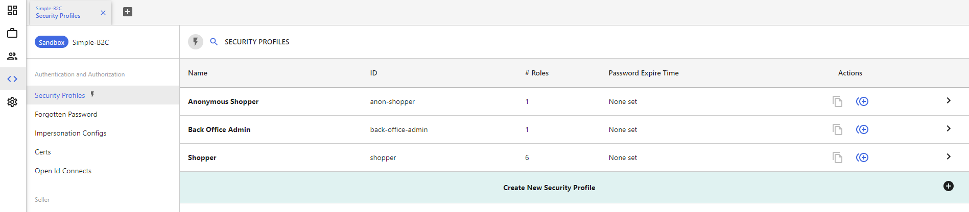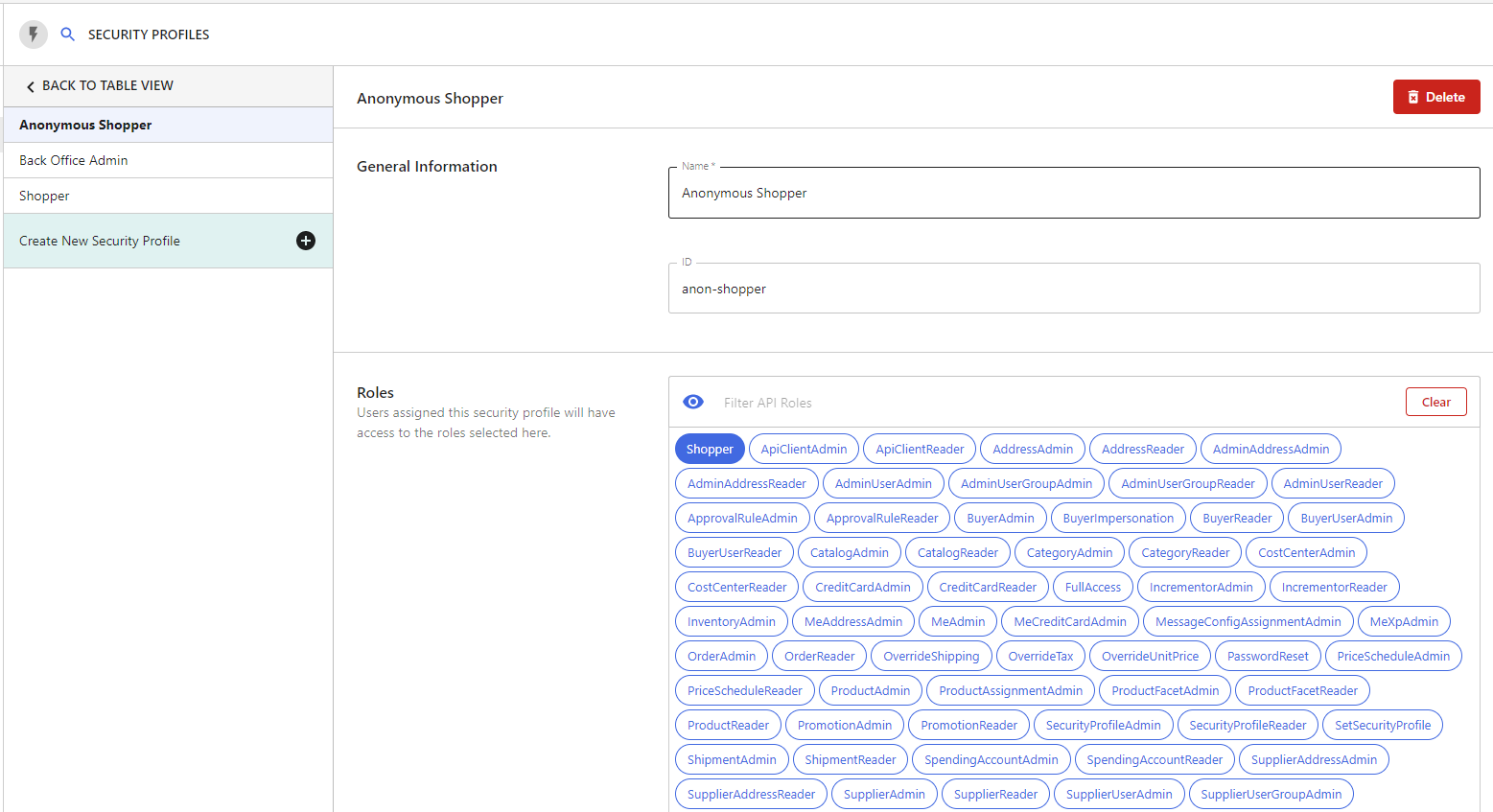The following security profiles have been created for a standard B2C scenario, allowing anonymous & authenticated shopping as well as back office administration.
