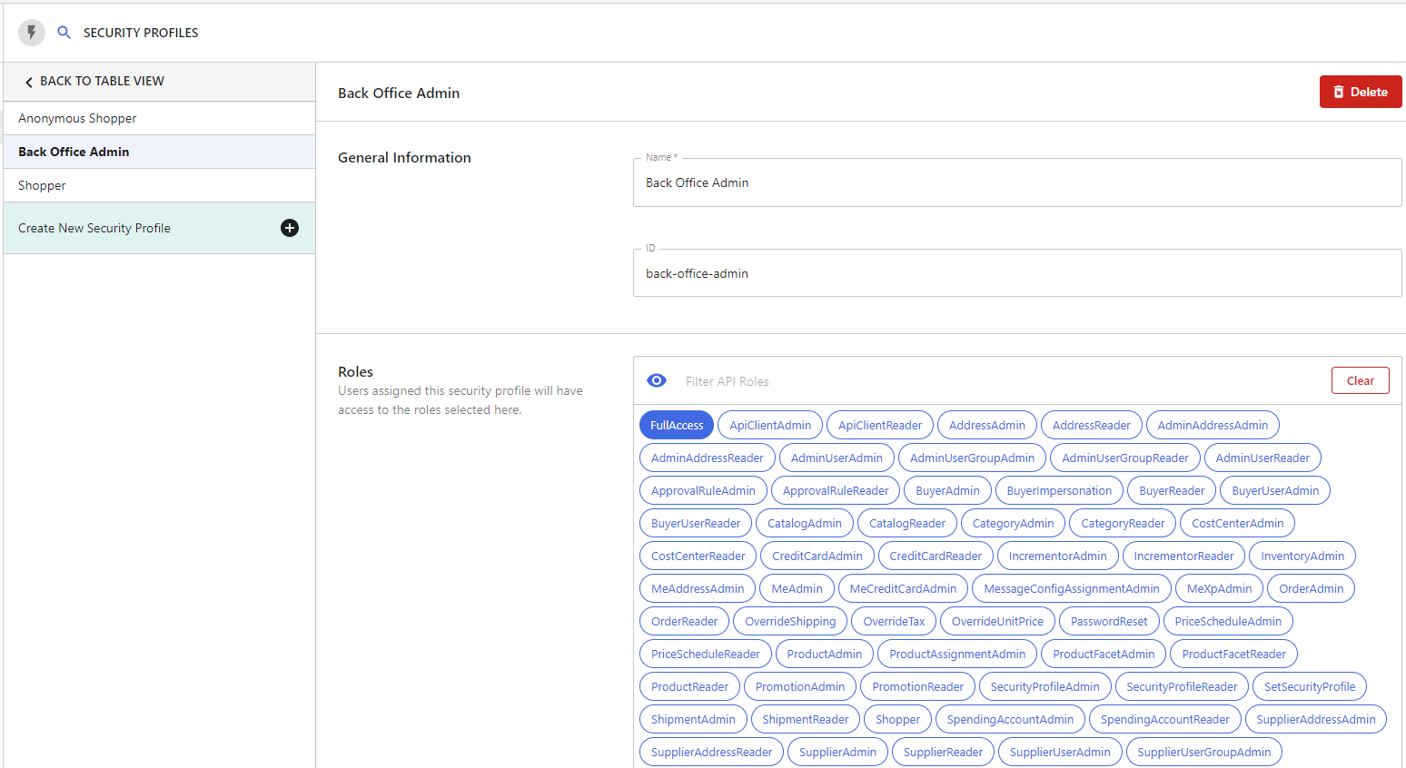 Lastly, the Back Office Admin security profile is for administrators of OrderCloud and has been assigned the FullAccess role to allow them to perform all actions.