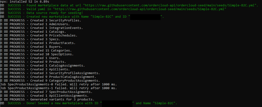 npx @ordercloud/seeding seed Simple-B2C -u={username} -p={password}You'll see the following success screen after running the command: