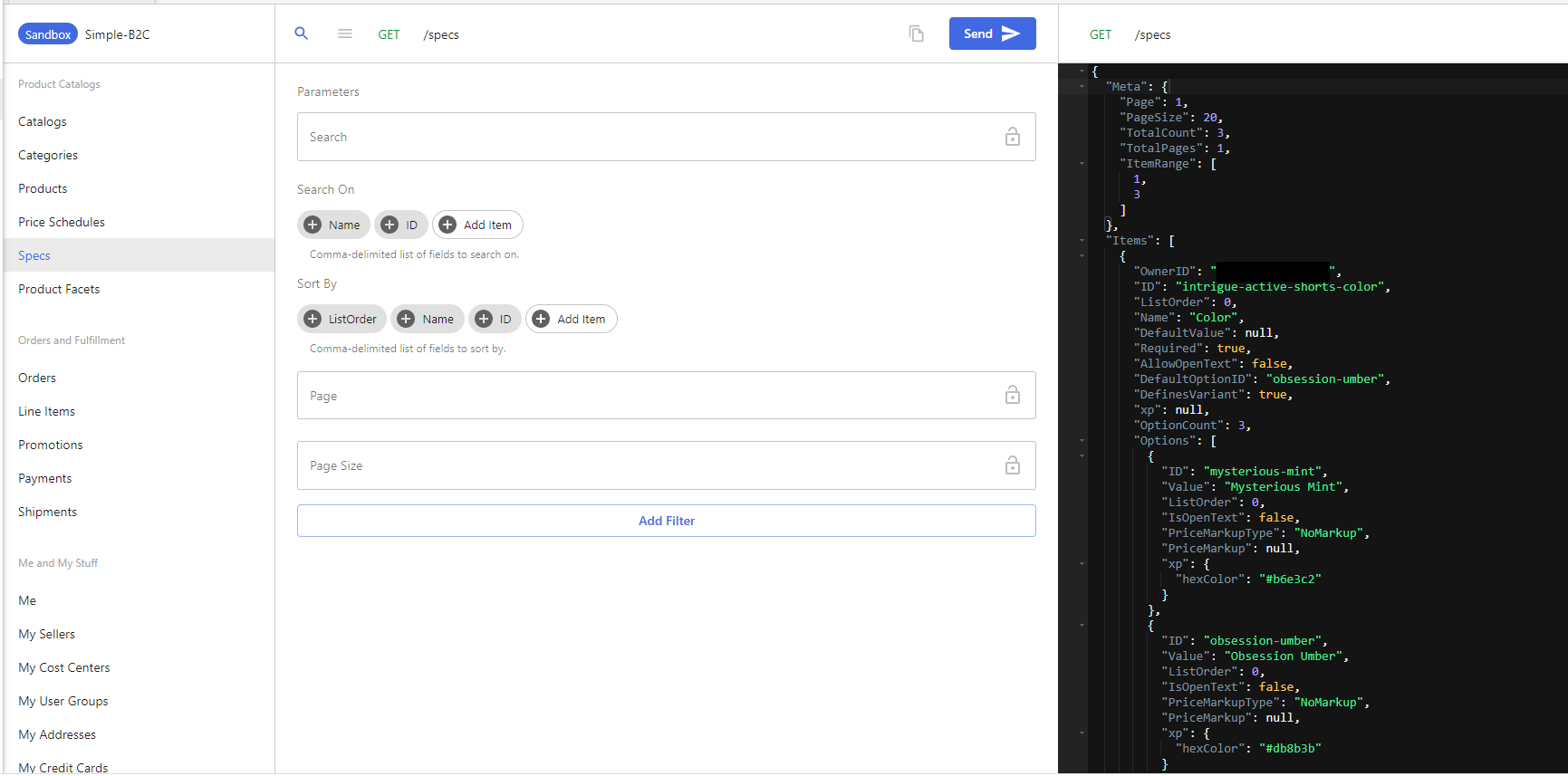 Specs are a set of options that can be associated with a product and are used to capture user selections when buying a product. Various Specs are created here to be associated to products in a separate step. One of the examples in this case is multiple colour options for a particular product. When setting up Specs, you can also additional attributes for each option via extended properties (XP) and price markups/markdowns based on the selected option. This can also be used to drive multiple product SKUs (variants) based on spec combinations. More information on this can be found here.