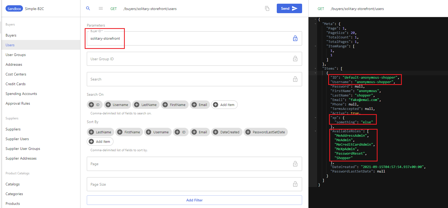 This user context will be used when making calls to the OrderCloud API from the storefront when a user has not logged in. Another thing to note is the demonstration of extended properties (XP) highlighted below where a custom property has been added to the user resource.
